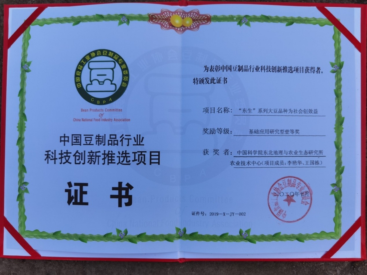 近日,2020年中国豆制品行业年会暨第七届中国大豆食品专用原料研讨会在安徽宿州召开,中国豆制品专业委员会揭晓了为中国豆制品行业发展作出突出贡献的“2020年中国豆制品行业品牌企业50强”“中国豆制品行业科技创新推选项目及科技创新人才”名单。东北地理所寒区大豆育种学科组李艳华、王国栋的“‘东生’系列大豆为社会创效益”项目荣获“基础应用研究型”项目一等奖。