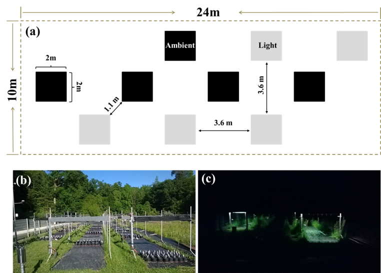 作为全球变化的一部分,光污染(夜间的人造光)对生态系统影响受到越来越多的关注。尽管许多研究表明光污染会对动物的行为、植物的物候造成影响,但是光污染是否会影响外来植物的入侵过程仍不得而知。针对这一研究空白,中科院东北地理所生物入侵生态学学科组刘艳杰研究员指导学生进行了夜间路灯模拟实验,对比广域与窄域的归化外来植物对夜间灯光的不同响应。实验选取了9对广域和窄域分布的归化外来植物,并在有无夜晚人工光源的处理下进行单独种植或与本地植物群落混合种植处理,经过一个生长季后测定了外来植物的生长表现。