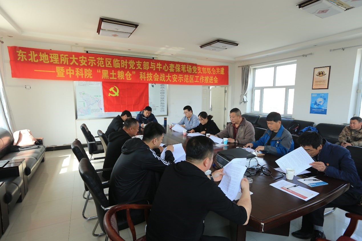 本次会议建立了东北地理所大安示范区临时党支部与牛心套保苇场党支部联合共建的新机制,树起了会战一线高高飘扬的第一面党旗,强化了党员在院地合作中的先锋模范作用,彰显了党组织在“黑土粮仓”科技会战中的战斗堡垒作用,示范区临时党支部的建立必将为“黑土粮仓”科技会战提供坚强的组织保障。