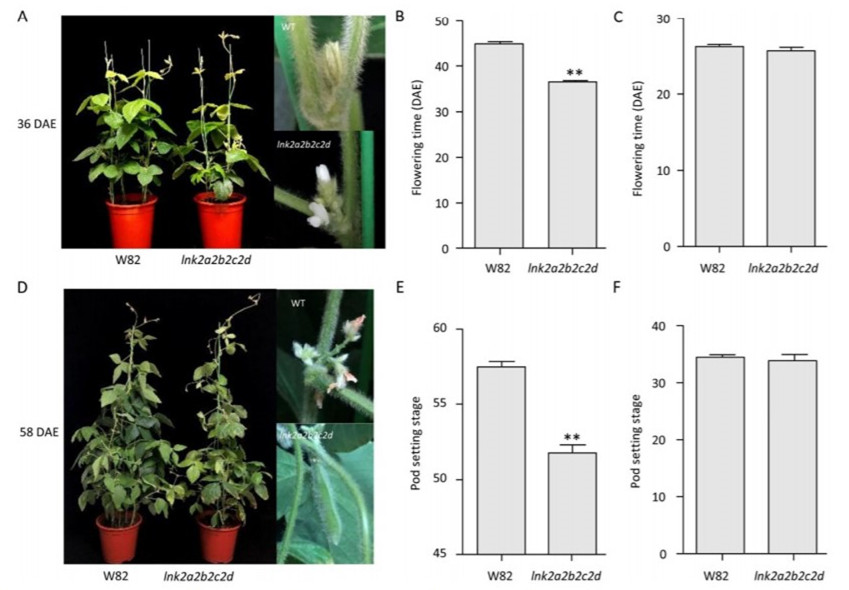 李赵博博士利用全基因组关联分析(Genome-wide association studies, GWAS)技术与拟南芥重要生物钟基因进行同源比对的方法,在大豆中鉴定到一调控开花期新基因LNK2 (Night light-inducible and clock-regulated 2)。利用CRISPR/Cas9开发出LNK2基因的转基因四重纯合突变体,在长日照条件下,四重突变体的开花时间明显早于野生型(图2)。荧光定量PCR显示,在长日照条件下,LNK2的转录水平明显低于野生型。LNK2促进了豆类特异性E1基因的表达,并抑制了开花素FT2a的表达。这些结果表明,CRISPR/CAs9介导的4个LNK2基因的靶向突变缩短了大豆的开花时间。