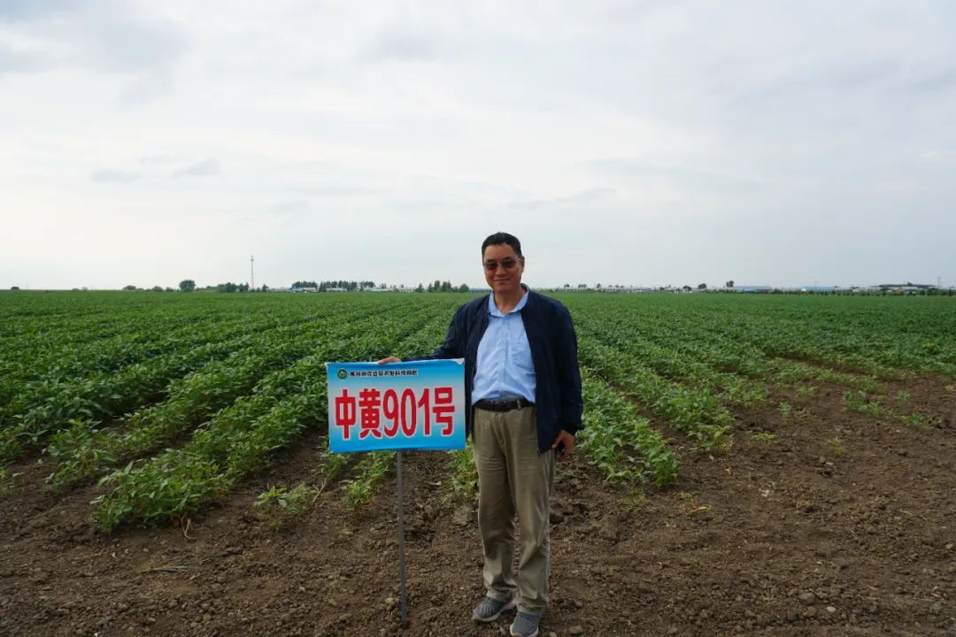 韩天富研究员在黑河与团队选育品种合影。国家大豆产业技术研发中心供图