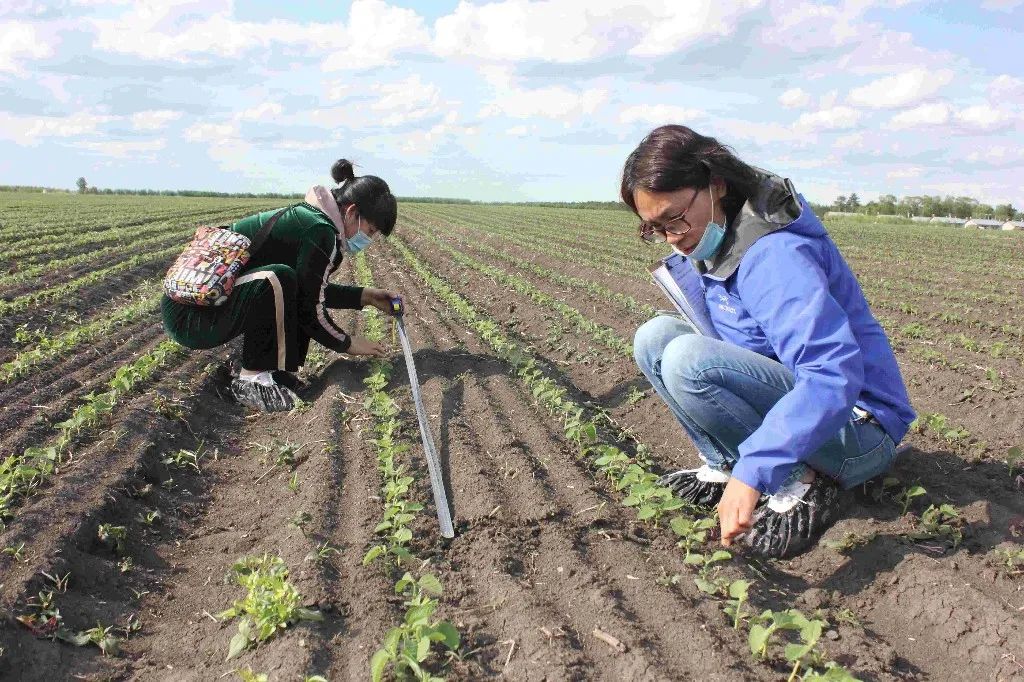 邹文秀(右)在田间调查大豆豆苗长势。受访者供图