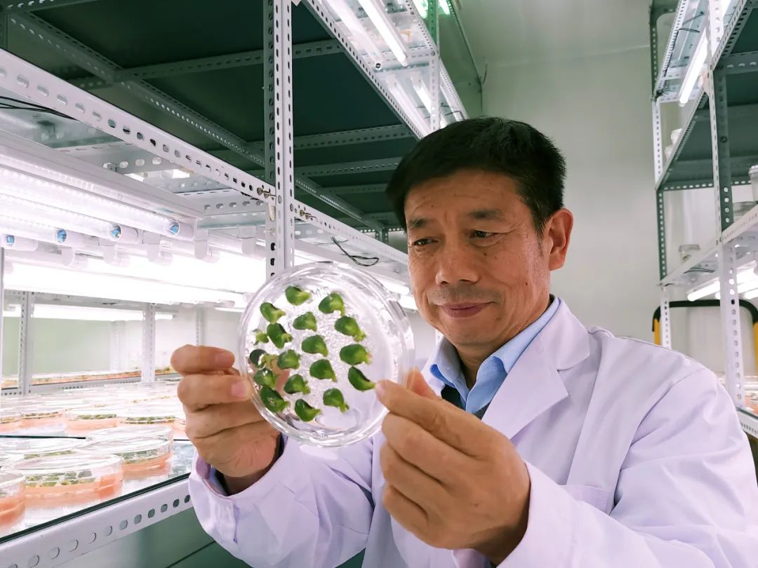 东北地理所冯献忠研究员正在观察大豆植株培养的生长情况。中国科学院东北地理与农业生态研究所供图