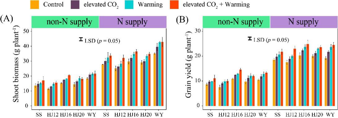 图1 大气CO2浓度和温度升高条件下5个品种水稻的生物量(A)和产量(B)