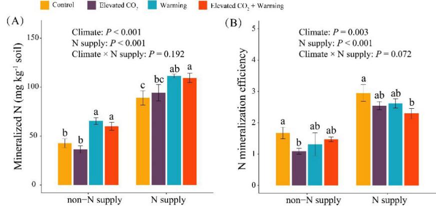 图4 大气CO2和温度升高条件下水稻土壤氮矿化量和氮矿化效率