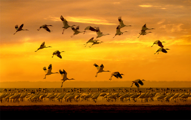 江西鄱阳湖国际重要湿地拍摄到的鹤群。国家林草局供图