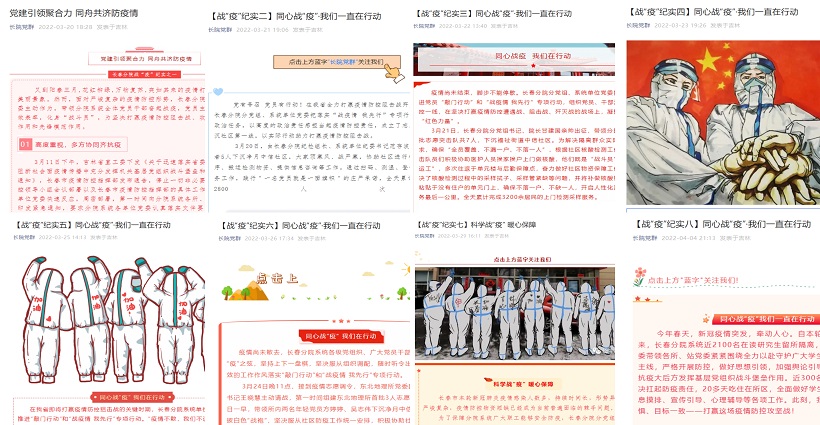为充分发挥先进典型的榜样引领、先进辐射作用,全方位激发基层党组织和党员的内生动力。2022年3月3日,创建了“长院党群”微信公众号??傻蔽颐腔钩两谟有律南苍弥惺保怀⊥蝗缙淅吹囊咔榇蚱屏嗽械钠骄?。战“疫”以来,“长院党群”陪伴着大家,叙写了一幕幕感动人心的故事,描绘出一帧帧团结友爱的画面,共同记录着我们携手走过的那段难忘的抗“疫”时光!