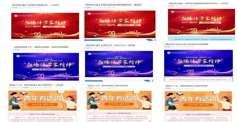 这一年,我们深入推进“传承老科学家精神 弘扬新时代科学家精神在行动”专项工作,将2022年9月定为“弘扬科学家精神,喜迎党的二十大”主题活动月,“长院党群”公众号先后开设【身边的榜样】、【誓言无声初心永恒】、【青年有话说·我心中的科学家】三个栏目,推出系列专题报道,积极宣传长春分院系统“科技创新先锋团队”、“四强标兵党支部”等的先进事迹,全面展示长春分院系统广大创新团队及党员突击队的“团队奋斗誓言”17个,以视频等形式推出青年心中的科学家作品17个,分层分类大力宣传、弘扬科学家精神,通过塑造科学家鲜活的先进典型形象,发挥其价值导向和示范引领作用,在分院系统上下迅速掀起学习先进、对标先进、争当先进的热潮,进一步提升基层党组织凝聚力战斗力。