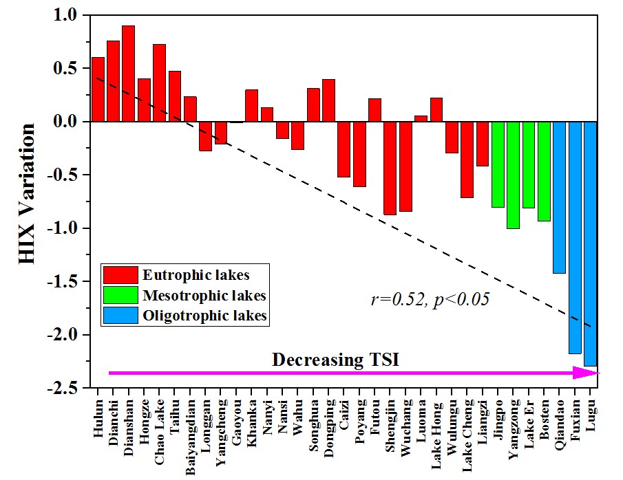 三维荧光技术被广泛应用到国内外各类水体中解析DOM组分和来源特征,荧光腐殖化指数(HIX)可以用来指示DOM腐殖化程度,与DOM来源具有高度相关性,目前对于大尺度区域湖泊CDOM组分来源遥感反演研究鲜少报道。中国科学院东北地理与农业生态研究所水环境遥感学科组科研人员通过对实测湖泊样品进行CDOM荧光组分特征分析,并结合GEE平台上Landsat反射率产品,基于机器学习算法构建了精度较高HIX遥感反演模型(R2=0.86,RMSE=0.29),通过GEE平台最终获取了2015年和2020年中国典型湖泊HIX遥感反演结果,结果表明随着湖泊营养状态降低,湖泊荧光腐殖化程度逐渐降低(图1),湖泊DOM荧光组分来源与水质状态具有显著相关性。本研究为深入探究湖泊DOM组分来源和水质环境监测提供了理论支撑。