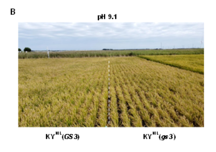 2022年,吉林省大安市盐碱地中(盐含量0.3%,pH 9.1)中水稻GS3 近等基因系的生长表型。