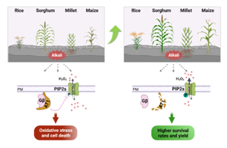 中科院遗传发育所谢旗领衔的科研团队与合作者独辟蹊径,首先通过全基因组大数据关联分析耐盐碱差异大的高粱资源,发现一个主效耐碱基因AT1,该基因与水稻的粒形调控基因GS3同源。同时,利用植物荧光探针系统发现,在高盐碱胁迫中,AT1通过调控水通道蛋白的磷酸化来调节在逆境情况下水通道蛋白的活性,并将逆境导致产生的ROS(活性氧物质)泵到细胞外降低氧化应激,首次揭示了作物耐盐碱的分子机制。此外,研究人员还发现AT1的调控机制在主要粮食作物水稻、小麦、玉米及谷子中也保守存在。