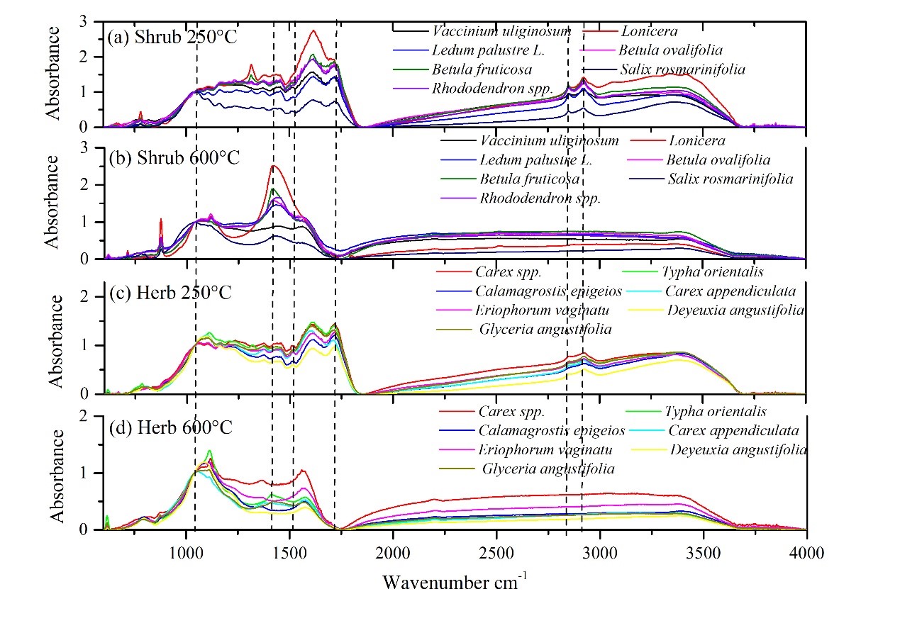 为深入了解火烧对泥炭沼泽碳库的影响,东北地理所科研人员以大兴安岭泥炭沼泽为研究对象。评估燃烧温度和燃料类型对其优势植被火后热解碳的化学组成的影响,并尝试利用热解碳的化学特性对历史时期野火燃料类型和野火强度等信息进行准确重建,评估其对泥炭沼泽中稳定性较高的含碳化合物(如芳香族化合物和Fe-OC聚合物)累积过程的影响。研究发现随着燃烧温度的增加,较高的燃烧温度促使热解碳中不稳定的化合物(例如脂肪族化合物和羧酸类化合物)损失,而高温产生的热解碳的热稳定性更高。利用FTIR 1515/1050和FTIR1720/1050峰高比率可以简单对热解碳来源和燃烧温度进行识别,既高的FTIR 1515/1050表示热解碳来自于灌木燃烧,低的FTIR 1515/1050表示热解碳来自草本燃烧;而高的FTIR 1720/1050表示热解碳来自于低温燃烧,低的FTIR 1720/1050表示热解碳来自于高温燃烧。其中对热解碳产生温度识别的准确性要明显高于对热解碳燃料来源的准确性。