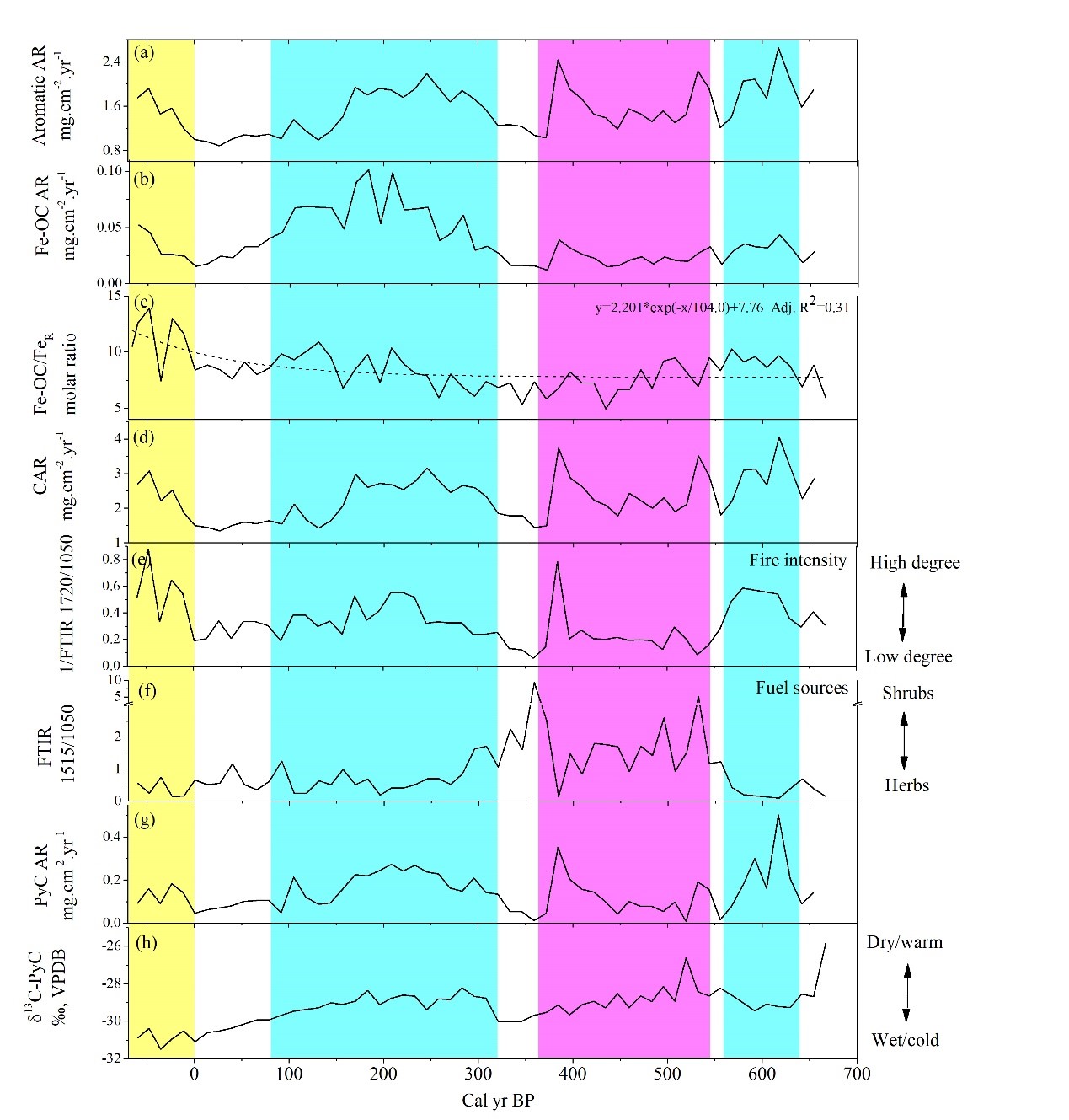 图2过去700年来大兴安岭北部野火强度和燃料来源变化及其对泥炭沼泽碳库中稳定性碳组分(芳香族化合物)和活性碳固持量(Fe-OC聚合物)的影响。