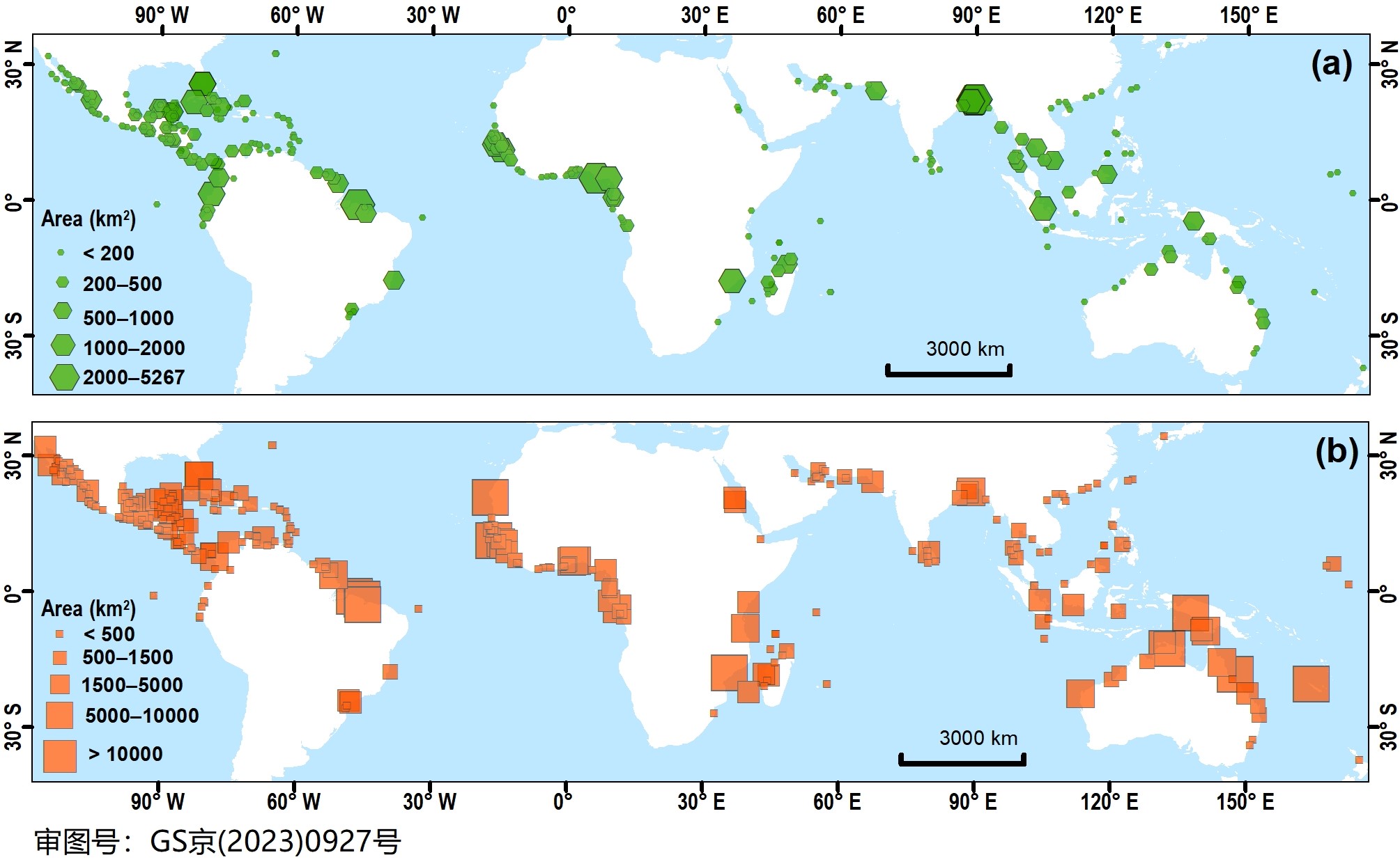 与之前发布的全球红树林数据相比,HGMF_2020具有如下三方面的优势:①空间分辨率更高,被精细刻画的红树林斑块包含具有地理学意义的属性信息;②红树林斑块空间形态完整、边界清晰,可直接用于后续的研究和分析;③漏分误差较低,包含更多零散分布的小面积红树林,总体制图精度达到95%以上。